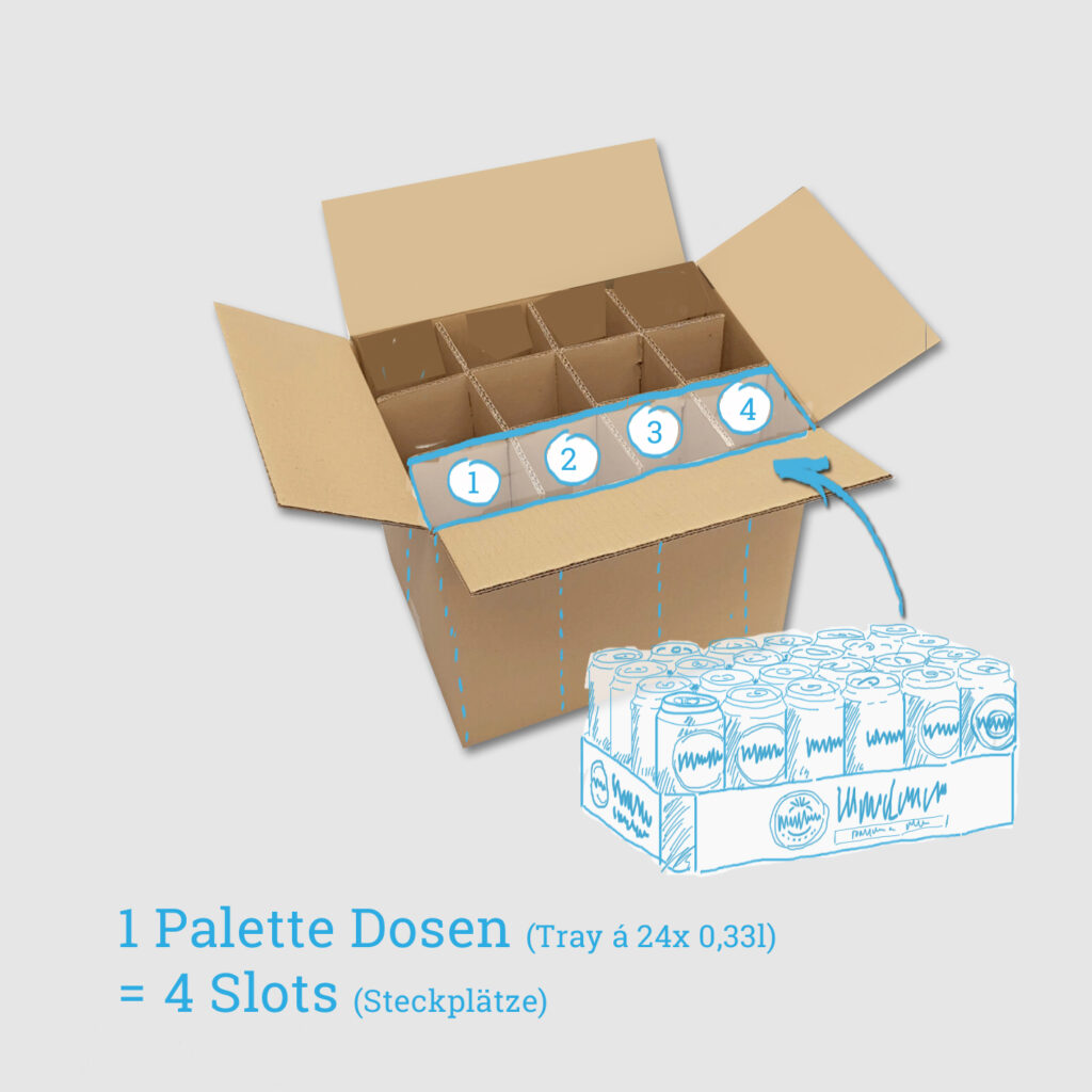 1 laatikossa on 12 paikkaa (paikkaa). 4 paikkaa tarjoaa tilaa 1 pahvilavalle (lokerolle). Lavalla on 24 kappaletta 0,33 litran tölkkejä.