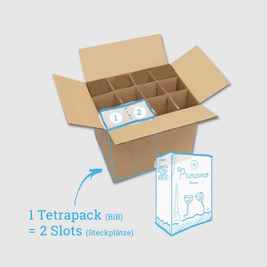 1 laatikossa on 12 paikkaa (paikkaa). 2 paikkaa tarjoaa tilaa 1 tetrapakkaukselle (BiB), jonka sisältö on 3 litraa. Esimerkiksi 6 tetrapakkausta viiniä mahtuu yhteen laatikkoon.