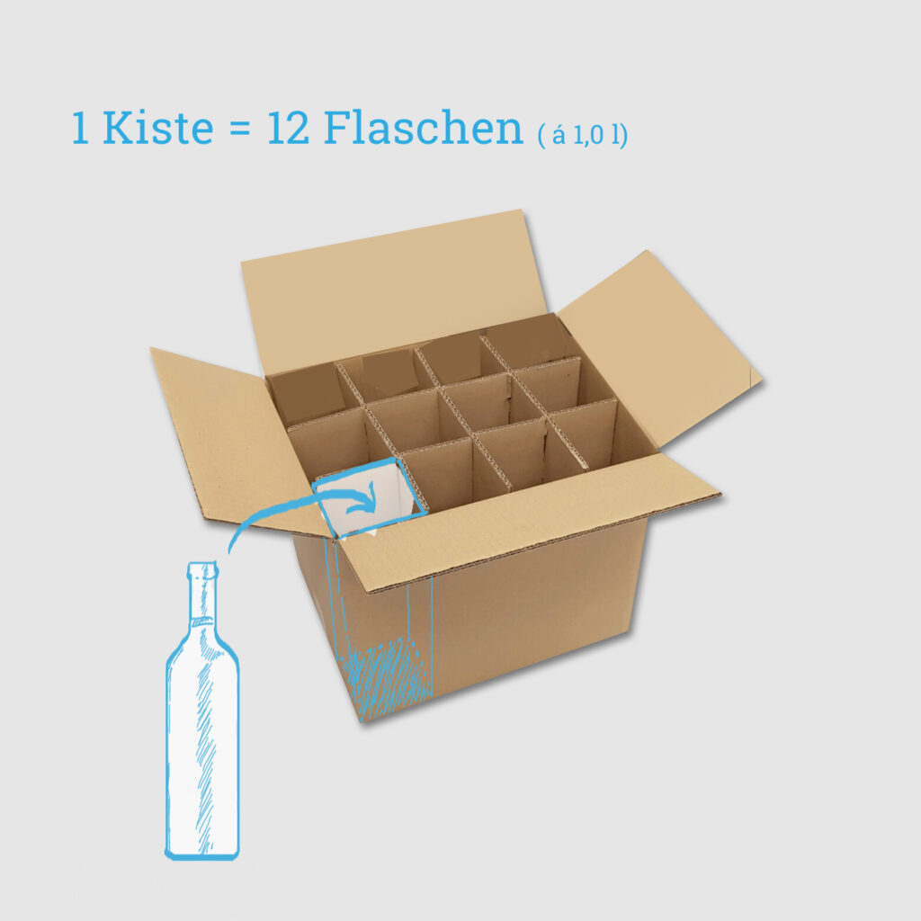 1 laatikossa on 12 paikkaa (paikkaa). Jokaiseen aukkoon mahtuu 1 litran pullo/viinipullo. Näin esimerkiksi 12 viinipulloa mahtuu yhteen laatikkoon.